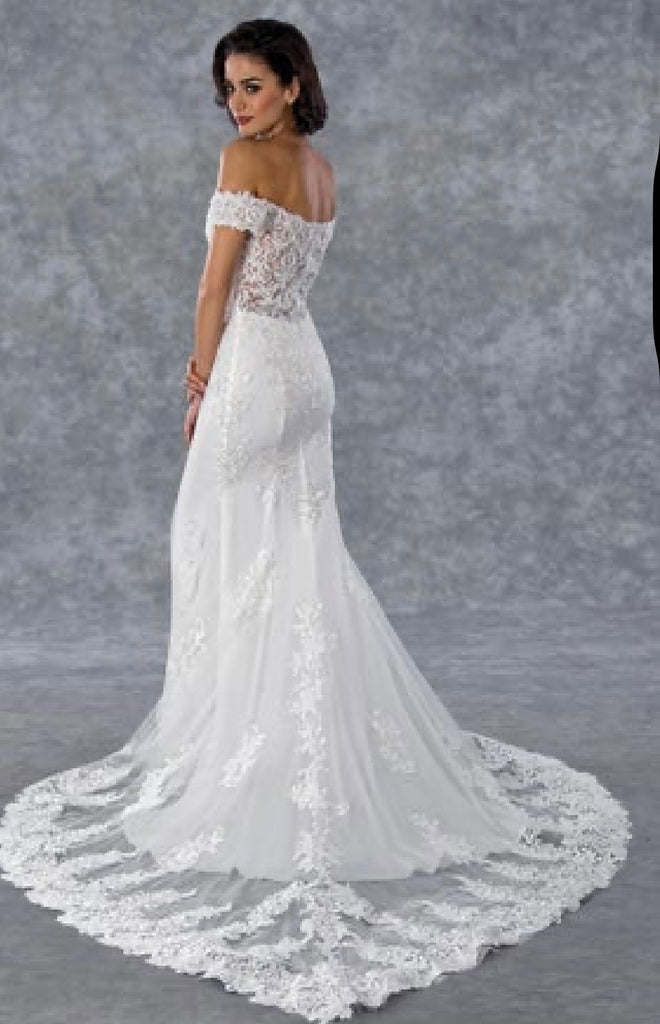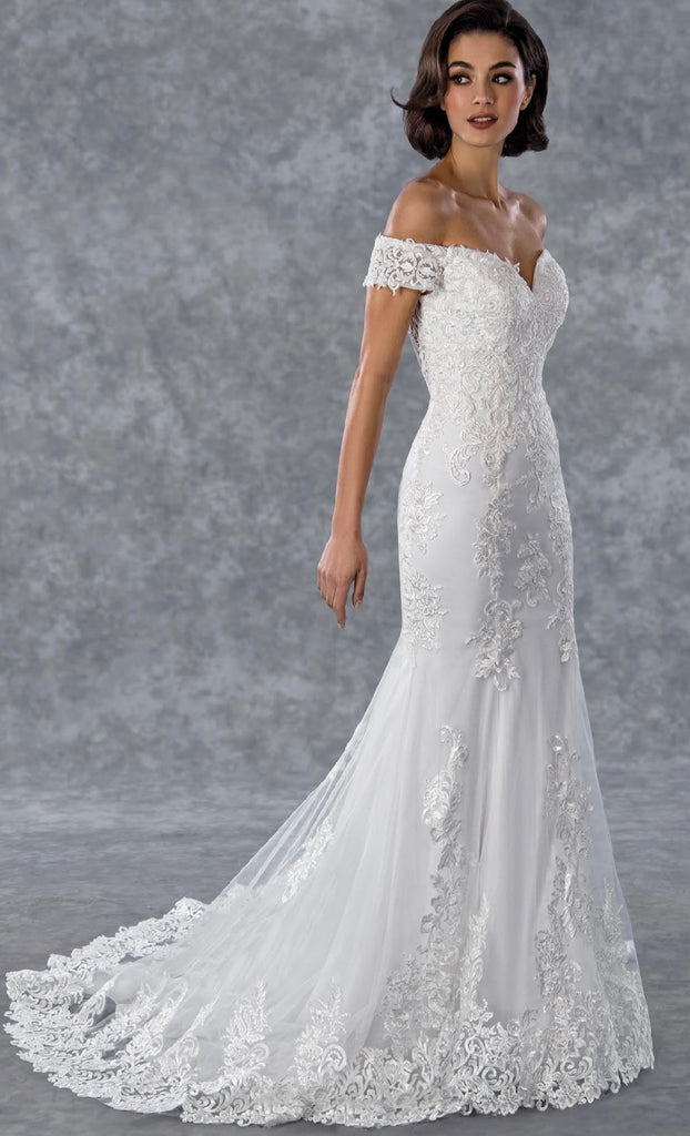 Beautiful off-the-shoulder bridal gown with lace bodice.