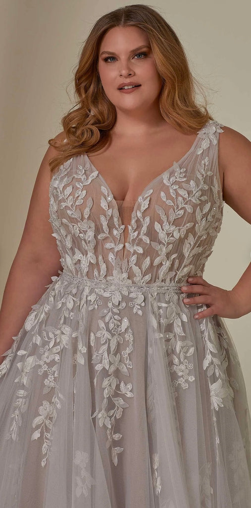 Boho A-line has botanical-inspired crystal beaded embroidered with whimsical 3D petals and a crystal beaded waistband to define your figure