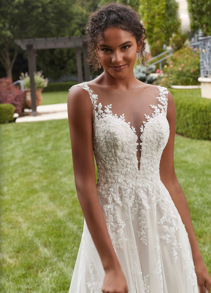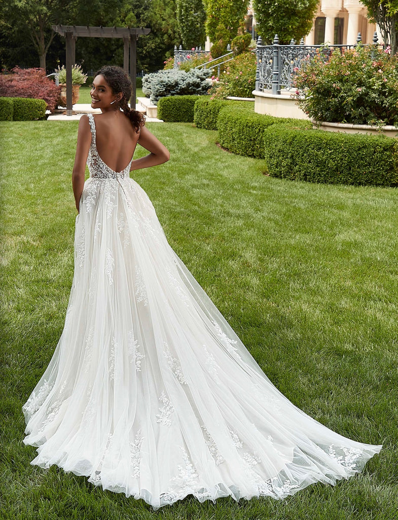 Elegant A-line has a plunging illusion bodice designed with beaded botanical embroidered appliqués and an open back.